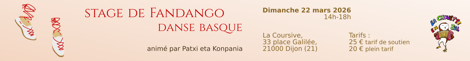 Le temps d'un après-midi, Patxi Perez nous enseignera le Fandango , la danse incontournable des bals au Pays Basque ! Sur un rythme à 3 temps, et dans une énergie entraînante, les danseurs et danseuse virent, volent et virevoltent au son des instruments.